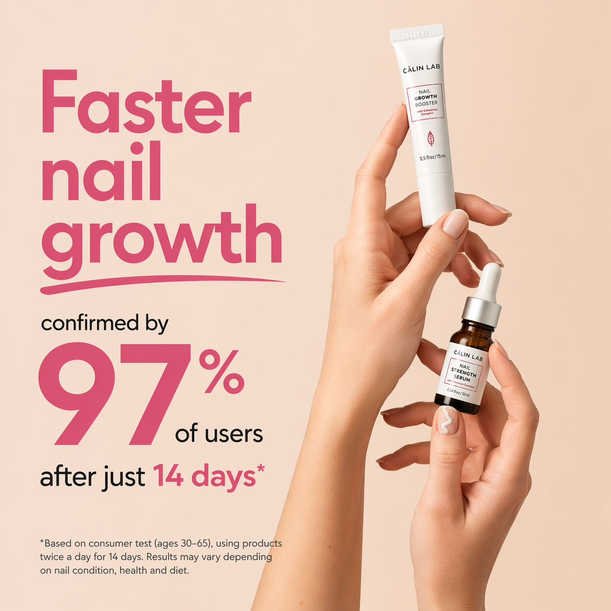 Apply to clean nails twice a day. Start with Nail Growth Booster, followed by Serum.